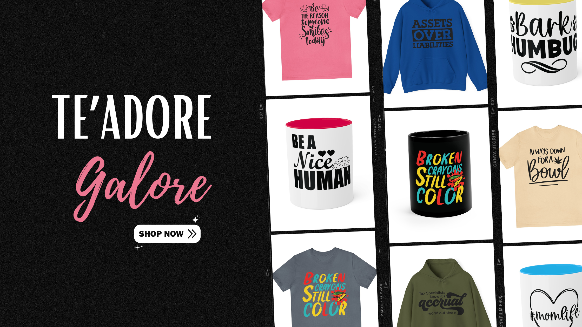 Born from an Entrepreneurs idea to create, Te'Adore Galore isn't about whats trending. Its about emotions, clothing and other items that speak to your soul and connect us in an ever changing kindred spirit community. This is the starting point, of course. Feel free to send us ideas of collections you would like to see or that resonate with your whimsy, bazaar and self-love expressions.
